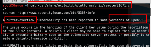El exploit consiste en la explotación de un buffer overflow, pero el problema ocurre durante la negociación del protocolo SSLv2. Si se repasa con atención toda la información que se ha obtenido es fácil descartar el uso de este exploit, debido a que no aplica en el contexto actual. Ninguno de los puertos activos está utilizando SSL. Por lo tanto, mejor no dedicarle más tiempo a este vector y olvidarlo.