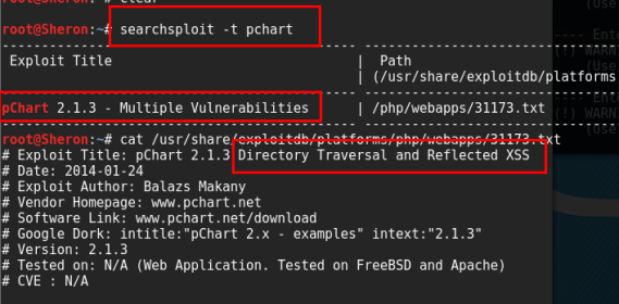 En este punto, como se dispone de la versión exacta de pChart ( y recordando lo encontrado en Google) se utiliza la tool searchsploit:
