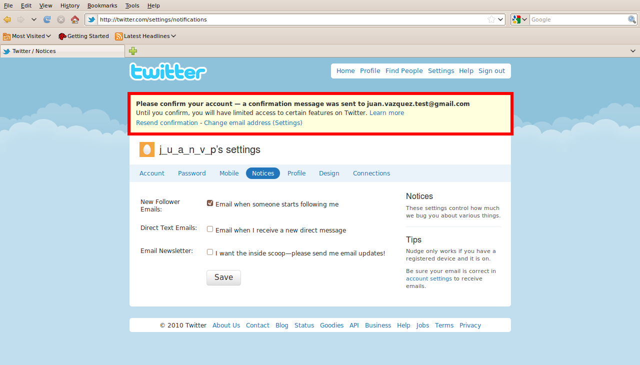 POST /settings/notifications/update HTTP/1.1 Host: twitter.com User-Agent: Accept: text/html,application/xhtml+xml,application/xml;q=0.9,*/*;q=0.8 Accept-Language: en-us,en;q=0.5 Accept-Encoding: gzip,deflate Accept-Charset: ISO-8859-1,utf-8;q=0.7,*;q=0.7 Keep-Alive: 115 Proxy-Connection: keep-alive Referer: http://twitter.com/settings/notifications Cookie: Content-Type: application/x-www-form-urlencoded Content-Length: 249 authenticity_token=&user%5Bsend_new_friend_email%5D=1&user%5Bsend_new_friend_email%5D=0&user%5Bsend_new_direct_text_email%5D=0&user%5Bsend_email_newsletter%5D=0&user%5Bemail%5D=juan.vazquez.test@gmail.com&commit=Save